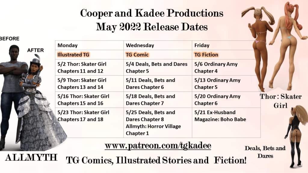 I have a lot of really fun TG stuff coming out in April! TG Comics, Illustrated Stories and Fiction. Come join us for some fun! www.patreon.com/tgkadee