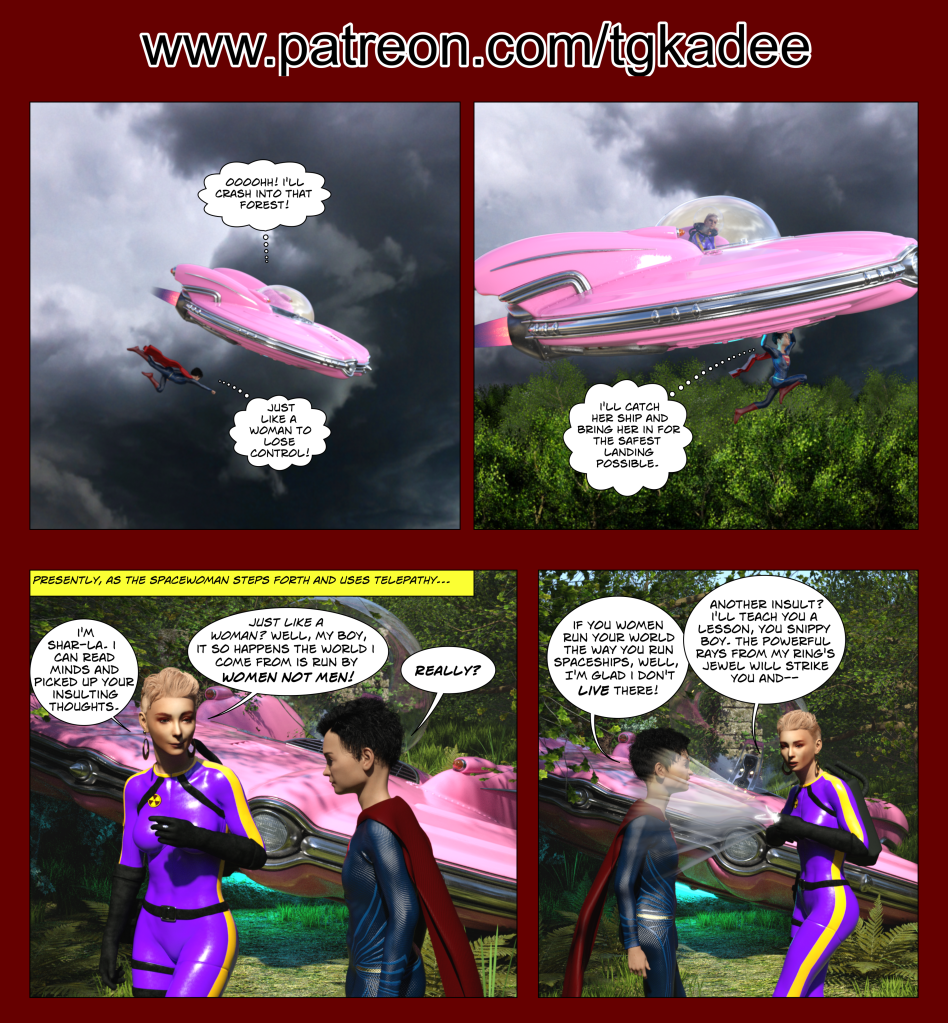 The latest and greatest episode of Super Sister is now on Patreon bringing the total to 11 installments. In the story, Super Boy makes sexist comments to an alien who decides to teach him a lesson by transforming him into a girl. Now, SHE has to navigate life at Smallville High School as a cute female.