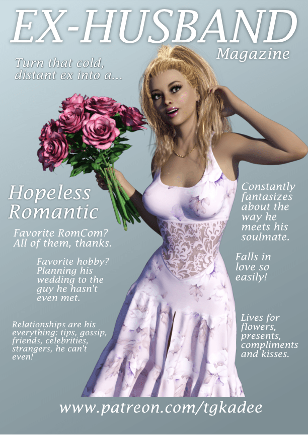 The latest issue of Ex-Husband Magazine is dropping in weekly installments on my Patreon starting 10/9. If you are not familiar with the series, in it bitter ex-wives are granted the power to transform their exes into not just women, but specific types of women. Past issues have seen the wayward men transformed into French Maids, Feminists, 1950s Housewives and more! Join today to receive exclusive early access to each of the new chapters! Or, if you find this after October 2023, you’ll receive access to the whole thing!